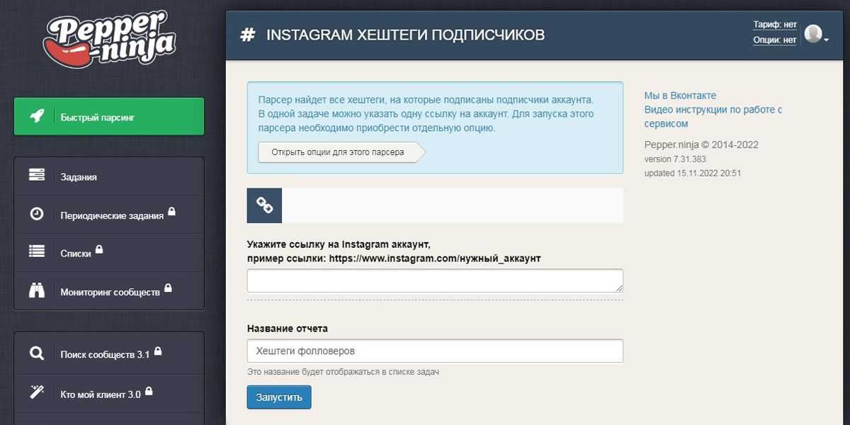 Pepper.Ninja – сервис парсинга в соцсетях. В нем есть инструмент «Хештеги подписчиков» – он собирает хештеги, на которые подписана аудитория любого открытого аккаунта, вашего или конкурентов.