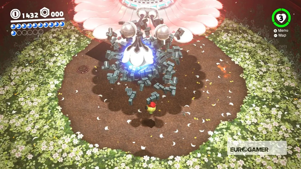 В этой гигантской битве за цветок роботов используется Искоренить корень, так что не теряйте его ни в коем случае. Когда вы начнете, вы увидите три синих стручка, защищенных кубиками серого камня. Растягивайтесь, чтобы уничтожить каждого из них, избегая при этом лазеров, которыми он нацелен на вас. Уничтожьте все три, затем потянитесь посередине робота, чтобы повредить его.