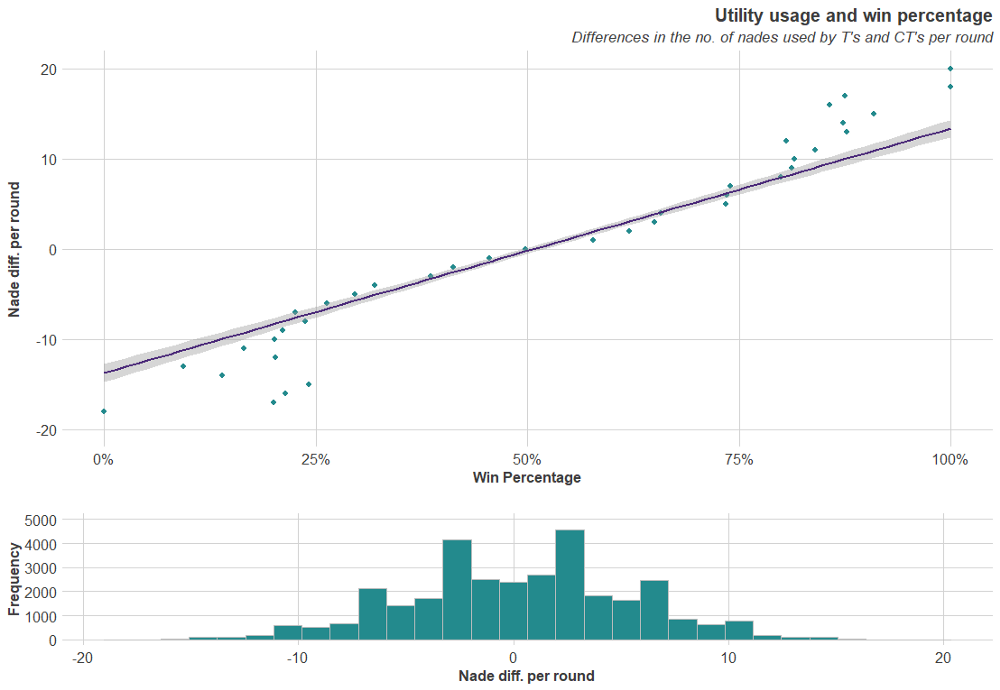 Π€ΠΈΠΎΠ»Π΅ΡΠΎΠ²Π°Ρ Π»ΠΈΠ½ΠΈΡ ΠΈΠ»Π»ΡΡΡΡΠΈΡΡΠ΅Ρ Π²Π·Π°ΠΈΠΌΠΎΡΠ²ΡΠ·Ρ ΠΌΠ΅ΠΆΠ΄Ρ Π΄Π²ΡΠΌΡ ΠΎΡΡΠΌΠΈ Nade diff. per round β ΡΠ°Π·Π½ΠΈΡΠ° Π² ΠΊΠΎΠ»ΠΈΡΠ΅ΡΡΠ²Π΅ Π³ΡΠ°Π½Π°Ρ Π·Π° ΡΠ°ΡΠ½Π΄ ΠΈ Win percentage β ΠΏΡΠΎΡΠ΅Π½Ρ Π²ΡΠΈΠ³ΡΡΡΠ΅ΠΉ, ΠΈ ΡΠΎΠΎΡΠ½ΠΎΡΠΈΡΡΡ ΠΏΠΎ ΡΠ°ΡΡΠΎΡΠ΅ ΡΠ°ΡΠ½Π΄ΠΎΠ² Ρ ΡΠ°Π·Π½ΠΈΡΠ΅ΠΉ Π² 3, 5, 10 ΠΈ Ρ.Π΄. Π³ΡΠ°Π½Π°Ρ (ΠΏΠΎΠΊΠ°Π·Π°Π½ΠΎ Π½Π° Π³ΠΈΡΡΠΎΠ³ΡΠ°ΠΌΠΌΠ΅ Π½ΠΈΠΆΠ΅) .ΠΠ°ΠΆΠ΅ΡΡΡ, ΡΡΡΠ΅ΡΡΠ²ΡΠ΅Ρ ΡΠ΅ΡΠΊΠ°Ρ ΡΠ΅Π½Π΄Π΅Π½ΡΠΈΡ ΠΌΠ΅ΠΆΠ΄Ρ ΠΊΠΎΠ»ΠΈΡΠ΅ΡΡΠ²ΠΎΠΌ Π±ΡΠΎΡΠ΅Π½Π½ΡΡ Π³ΡΠ°Π½Π°Ρ ΠΈ ΡΠ°Π½ΡΠ°ΠΌΠΈ Π²Π°ΡΠ΅ΠΉ ΠΊΠΎΠΌΠ°Π½Π΄Ρ Π½Π° ΠΏΠΎΠ±Π΅Π΄Ρ Π² ΡΡΠΎΠΌ ΡΠ°ΡΠ½Π΄Π΅.