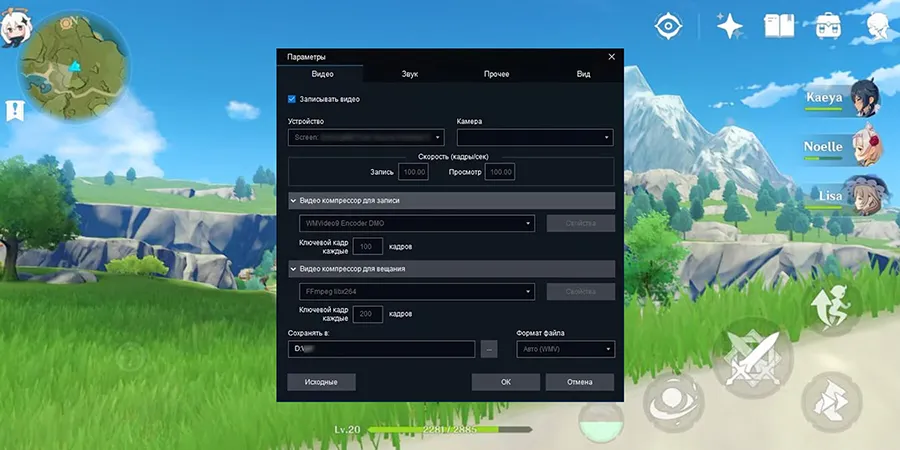 - настройка видеокодека;