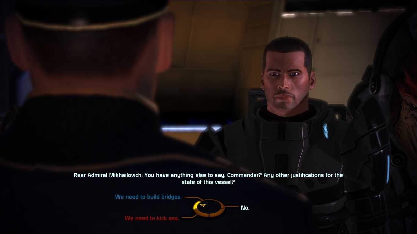 В классической трилогии Mass Effect есть система кармы, открывающая дополнительные варианты диалогов в случае достаточной “прокачки” в сторону Героя или Отступника. Однако это было только начало — появилось знаменитое колесо выбора, которое очень сильно ограничило возможности диалоговой системы. Варианты ответа отображаются не полностью, а хорошие и плохие ответы всегда находятся по левую и правую сторону соответственно. Видите, как Bioware позаботились о нас — вам даже думать не надо, просто перед игрой решите кем хотите быть и потом бесконечно выбирайте один и тот же ответ. Отыгрыш в чистом виде.