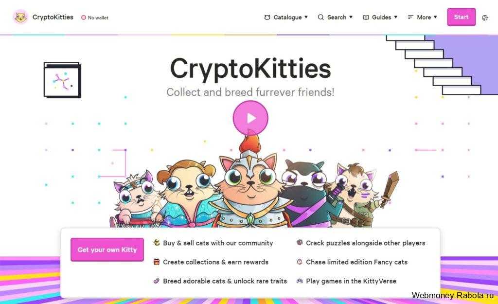 Пользователям предлагается приобрести виртуальное животное – котика. Его можно выращивать, скрещивать и продавать. Покупку персонажа можно провести внутри платформы или выкупить его у другого игрока. Каждый обладает определенными характеристиками, а чем они выше, тем дороже стоит питомец.