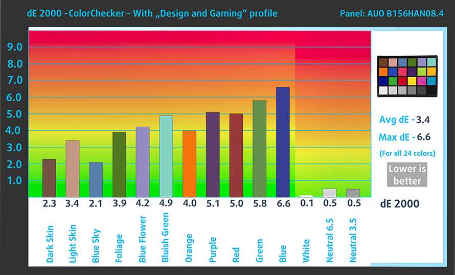 Мы протестировали точность дисплея с 24 часто используемыми цветами, такими как светлая и темная человеческая кожа, голубое небо, зеленая трава, оранжевый и т.д. Вы можете проверить результаты в заводских условиях, а также с профилем “Дизайн и игры”.