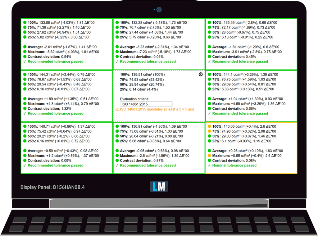 Измеренная максимальная яркость составляет 258 нит в центре экрана и 255 нит в среднем по всей области, с максимальным отклонением в 6%. Коррелированная цветовая температура на белом экране составляет 6880K – немного холоднее оптимального для стандарта sRGB значения 6500K.На иллюстрации ниже вы можете увидеть, как дисплей работает с точки зрения однородности. Другими словами, утечка света от источника света.