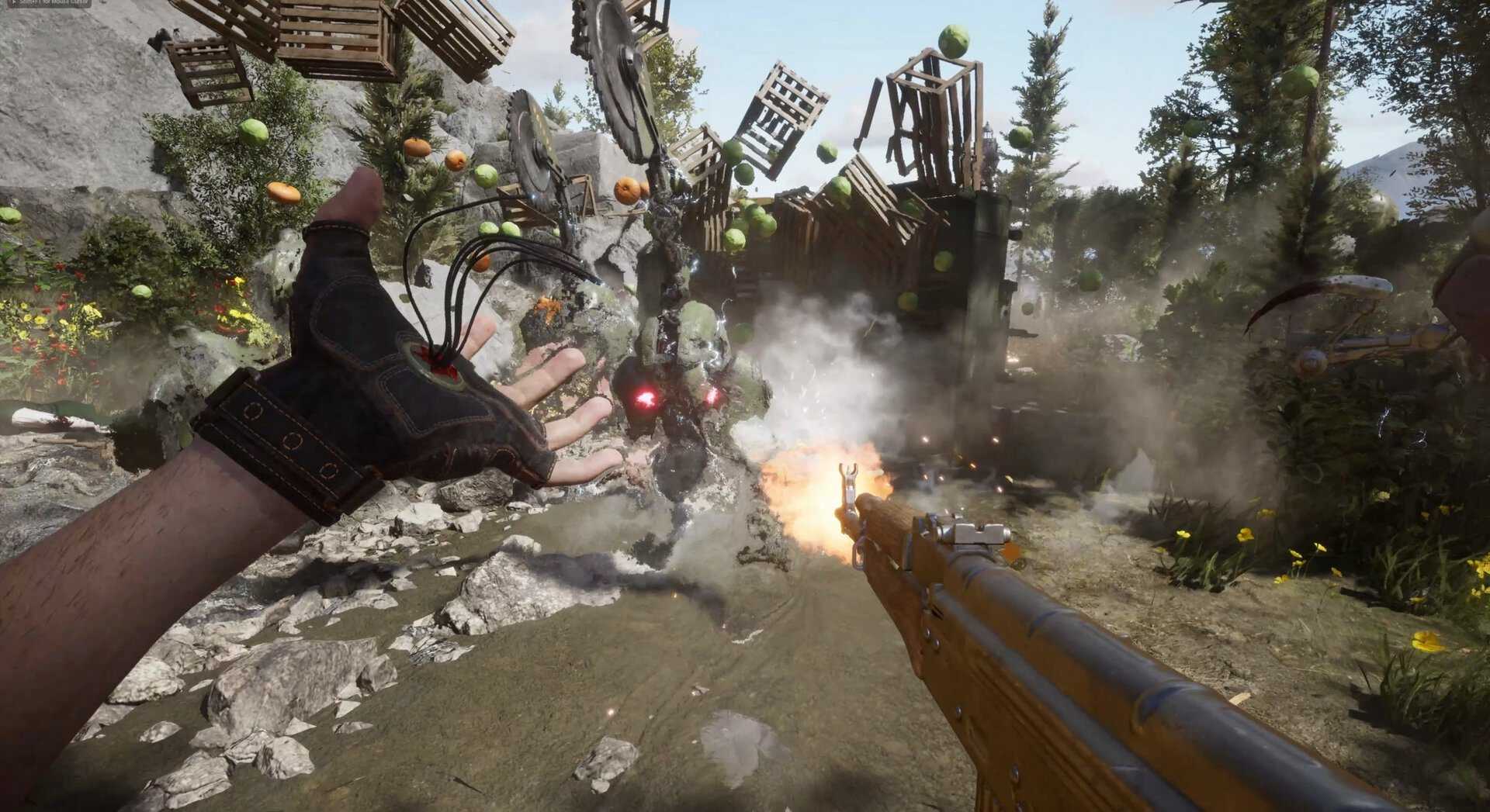 На десятом бою с Вовчиками я бы устал размахивать топором, но у Mundfish есть решение. Под конец игровой сессии я попал в открытый мир, где бродили толпы разных роботов, а герой раздобыл пушки и изучил мощные способности. Такой арсенал изменил боевку.