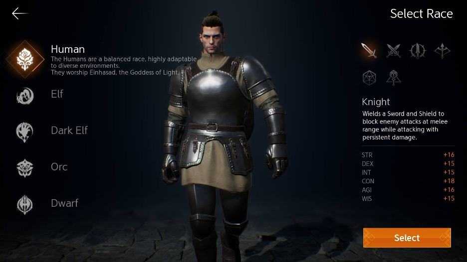 Персонажи делятся по расам: люди, гномы, эльфы, камаэли, орки и темные эльфы. Гномы и камаэли могут выбирать только один класс — воина, остальным расам доступен также класс мага. Каждая раса имеет свою столицу, в которой вы и сделаете свои первые шаги. Многознающий, но беспомощный НПС познакомит вас с историей расы и попросит выполнить несколько несложных заданий, успешно завершив которые вы получите экипировку. Достигнув 20 уровня и пройдя специальный квест вы сможете выбрать себе профессию. Изучение профессии открывает доступ к новым умениям. К основным профессиям относятся: рыцарь, лучник, кинжальщик, боевой маг и маг поддержки. Каждый персонаж может владеть 3 профессиями.