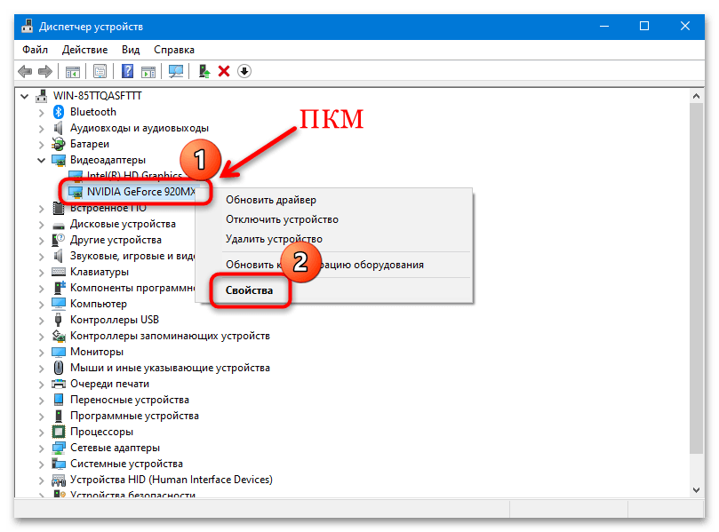 Также можно попробовать откатить версию драйвера — это поможет справиться с рассматриваемой неполадкой, если во время установки или скачивания программного обеспечения произошел сбой. В этой ситуации через «Диспетчер устройств» необходимо перейти в «Свойства» оборудования, дважды кликнув ЛКМ по названию компонента.