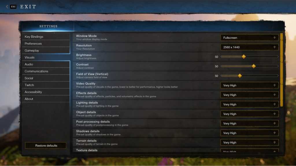 Рекомендуется снизить настройки графики в игре, чтобы повысить FPS. Запустите New World и перейдите в «Настройки» >> «Визуальные эффекты». Здесь вы можете понизить качество видео. Вы также можете настроить другие параметры в соответствии со спецификациями вашего ПК, чтобы увидеть, что помогает больше всего. Некоторые игроки также обнаружили, что установка ограничения FPS помогает, так что это определенно стоит попробовать.