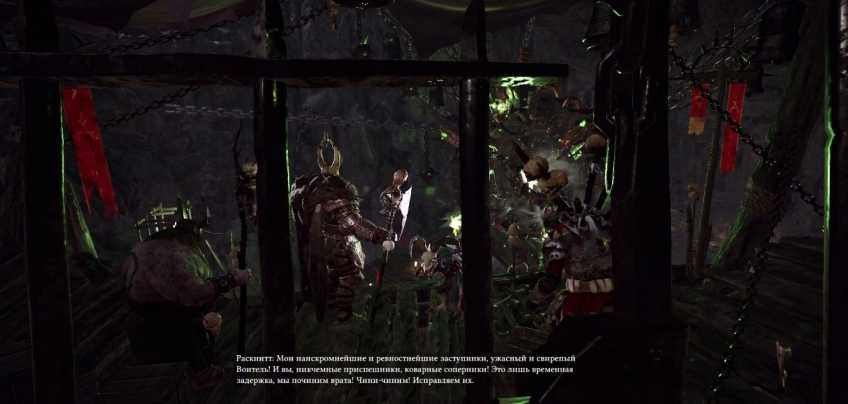 В одном из заданий герои долго пробираются канализационными туннелями под заброшенной лечебницей. В конце оказывается, что три мага-скавена проводят там обряд по призыву сил Хаоса. Нам приходится бегать по узкой дорожке вокруг ядовито-зелёной лужи неизвестно чего и срывать этот обряд, попутно отбиваясь от толп противников. Крысы лезут со всех сторон, издали лупит пулемётчик, хаосит теснит гнома в радиоактивную лужу, а жрицу огня на поводке утаскивает за угол крыс-поводырь (надеюсь, что просто съесть)…