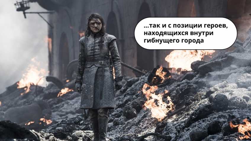 Эта параллель подчёркивает, пожалуй, главный недостаток заключительного сезона «Игры престолов». Ради драмы (уже натужной) в жертву приносится внутренняя логика мира, здравый смысл и наследие предыдущих этапов истории. Это затронуло и войну, и интриги, и образы персонажей, и их взаимоотношения.