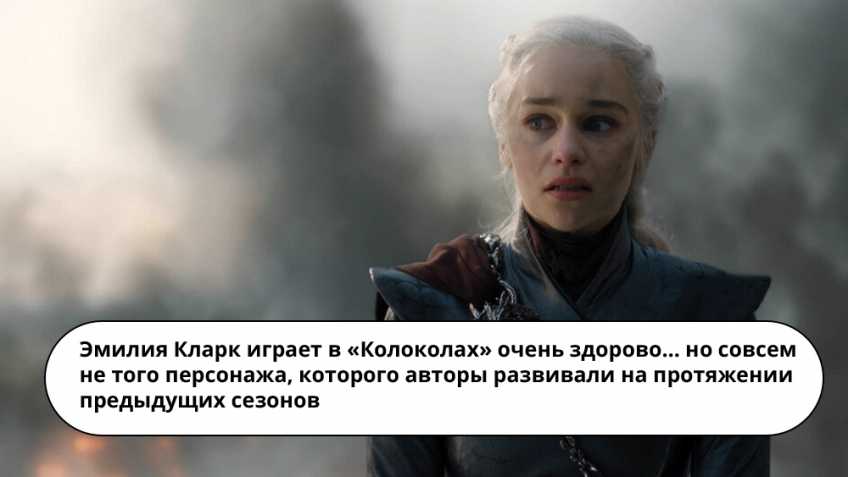 Подобных примеров можно привести ещё немало, но главный из них лежит в основе событий «Колоколов» и связан с Дейенерис, которая стремительно превращается в достойную дочь своего отца. Конечно, тревожные звоночки звучали и раньше — достаточно вспомнить, как Дени обошлась с Тарли. Но авторы не развивали эти её черты, постепенно подводя к тому, что происходит с ней сейчас. Наоборот, изрядно побитая жизнью девочка последовательно превращалась в сильного лидера: окружила себя мудрыми советниками и прислушивалась к их словам, отодвинула на второй план собственные амбиции ради спасения человечества, бросилась на выручку Джону Сноу и его товарищам.