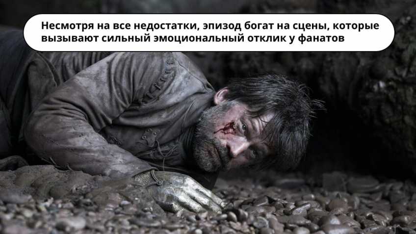 Самые милые и трогательные сцены смотришь с осознанием того, что они слишком трогательны, чтобы за эти счастливые мгновения персонажи не расплатились скорой смертью. Потому и скупая рыцарская романтика отношений Джейме и Бриенны разбивает сердце. Не обошлось без клише вроде «секса напоследок», но на это хочется закрыть глаза. Сам постулат «завтра мы все умрём» уже можно назвать клише, что не отменяет его жизненности.