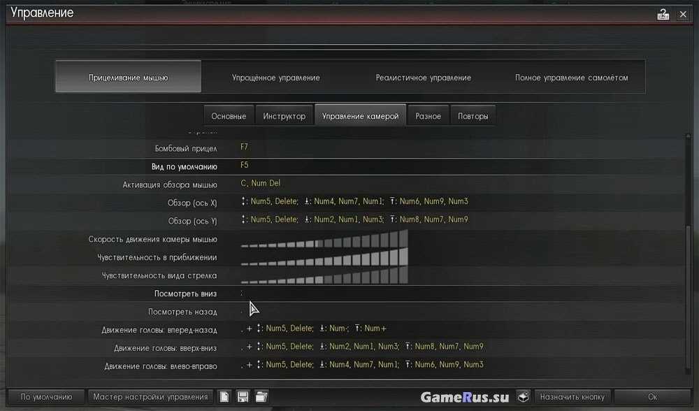 «Активация обзора мышью» — «С», при нажатии на нее вы можете крутить камеру, как угодно, самолет при этом не будет за ней поворачивать.